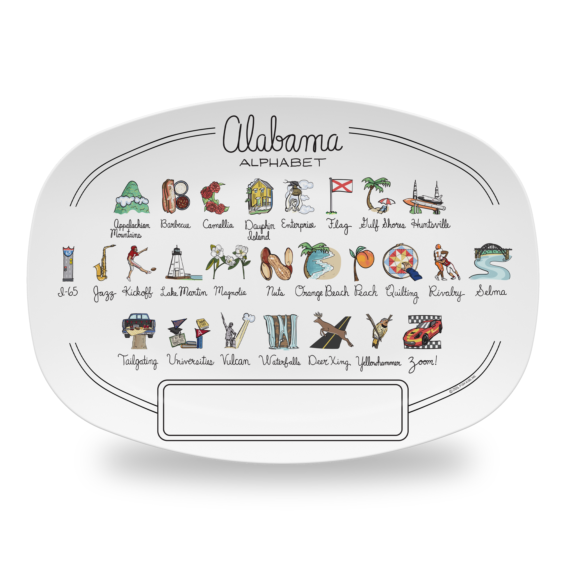 From the beloved Appalachian Mountains to the "Zoom!" of race cars, your Alabama Alphabet Platter is filled with all things A-Z that make your state one-of-a-kind. Our unique platter is handmade from revolutionary new material, (similar to a heavy plastic), that is: