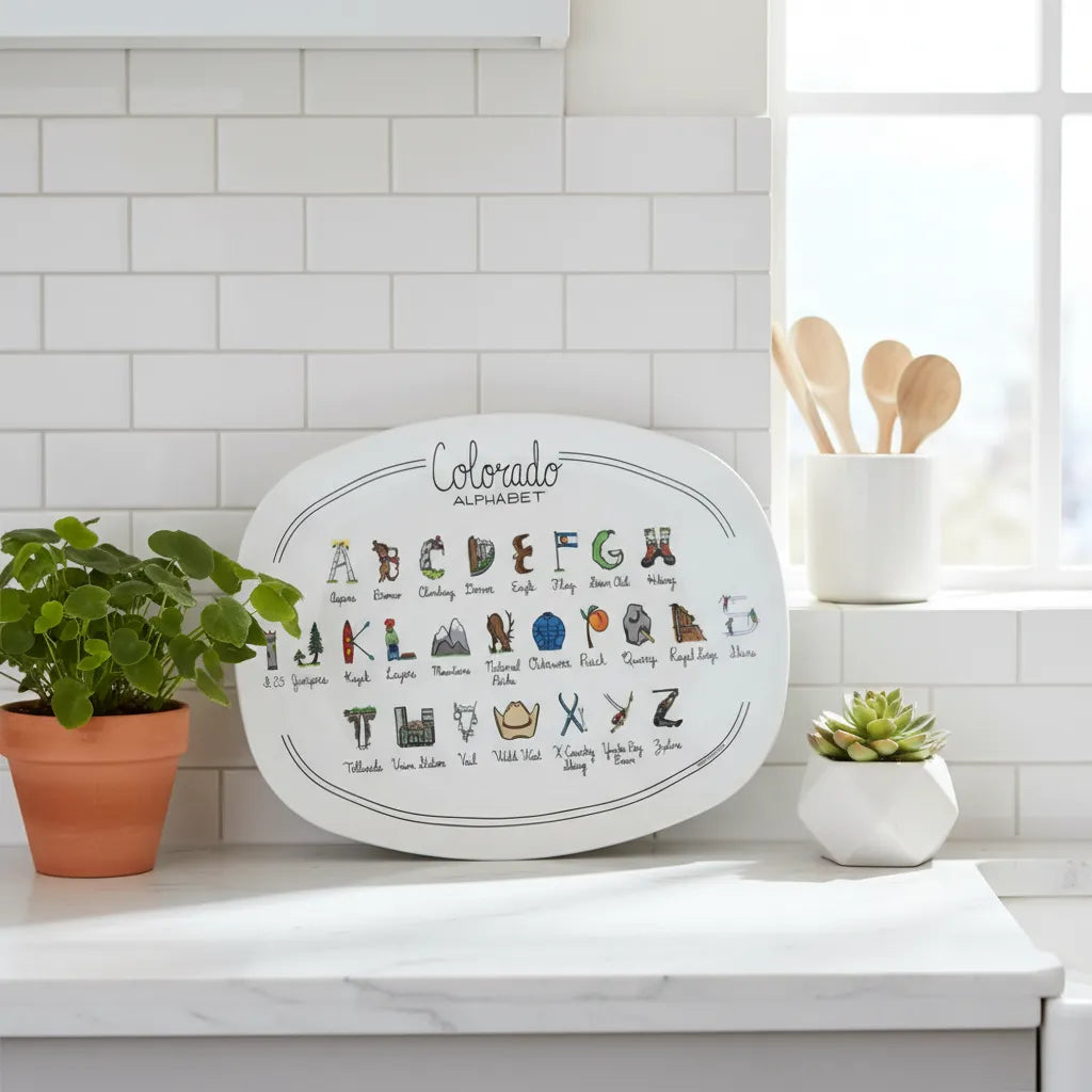 From Aspens to the Ziplines, your Colorado Alphabet Platter is filled with all things A-Z that make your state one-of-a-kind. Our unique platter is handmade from revolutionary new material, (similar to a heavy plastic), that is: