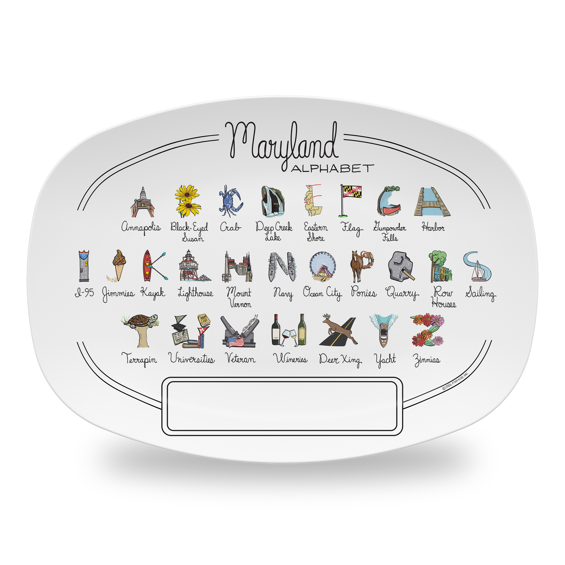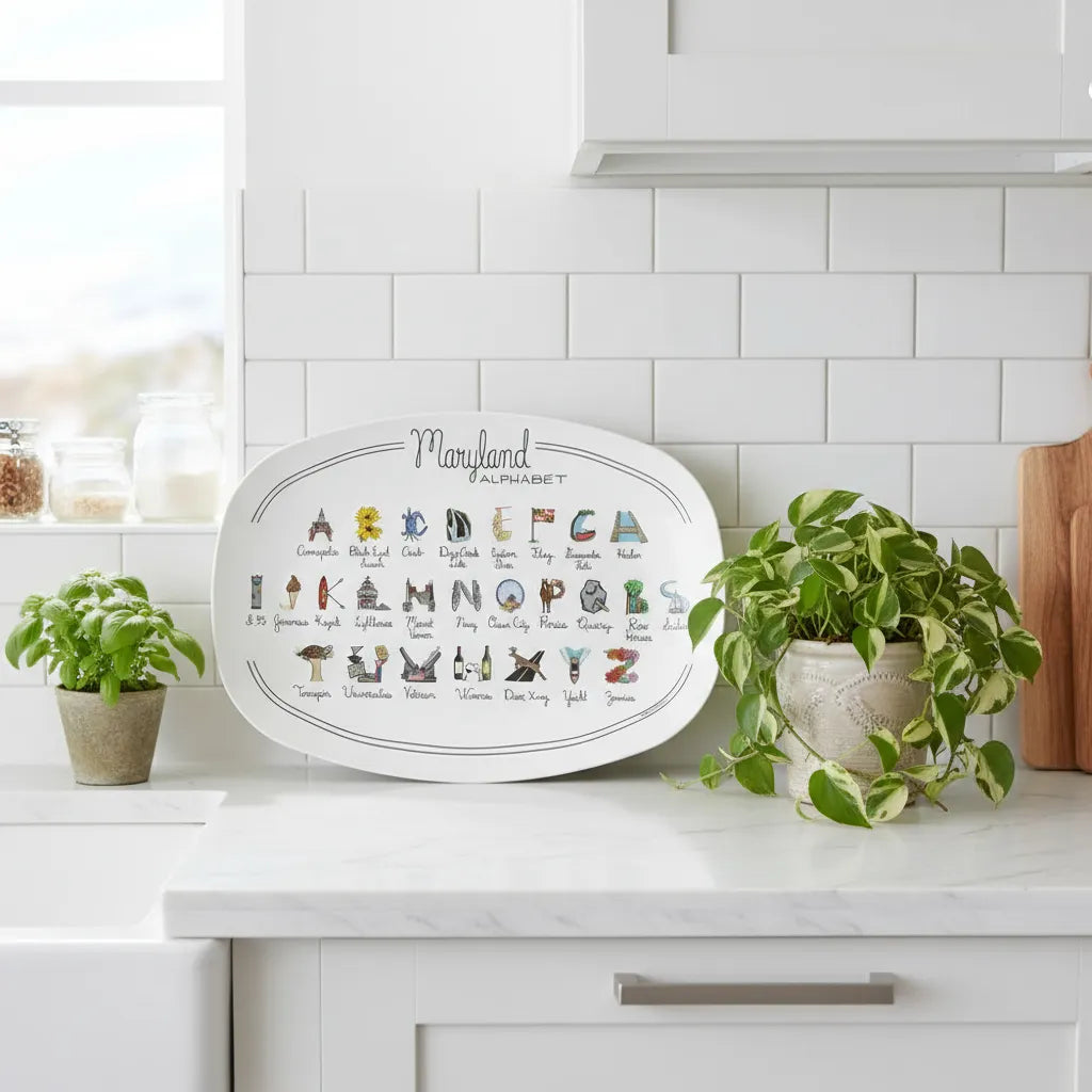 From Annapolis to the Zinnias, your Maryland Alphabet Platter is filled with all things A-Z that make your state one-of-a-kind. Our unique platter is handmade from revolutionary new material, (similar to a heavy plastic), that is: