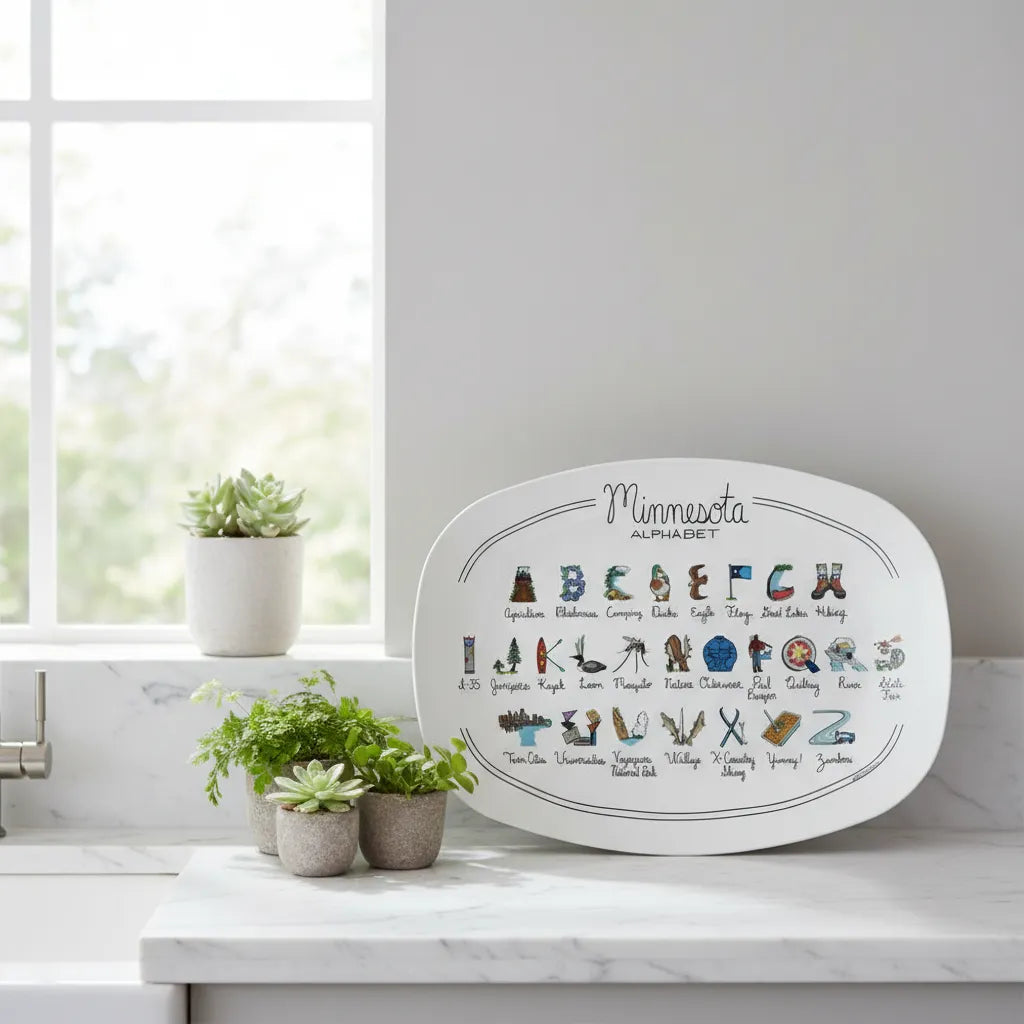 From Agriculture to the Zamboni, your Minnesota Alphabet Platter is filled with all things A-Z that make your state one-of-a-kind. Our unique platter is handmade from revolutionary new material, (similar to a heavy plastic), that is:
