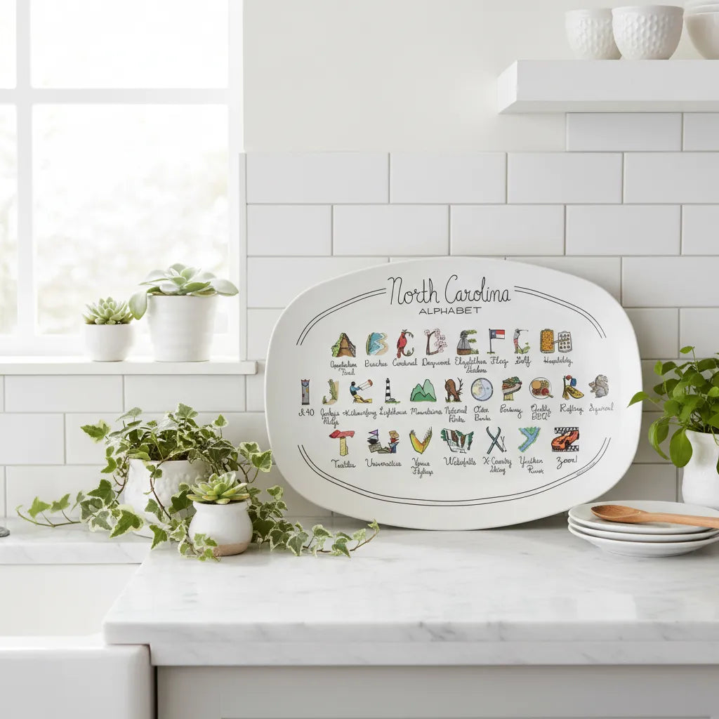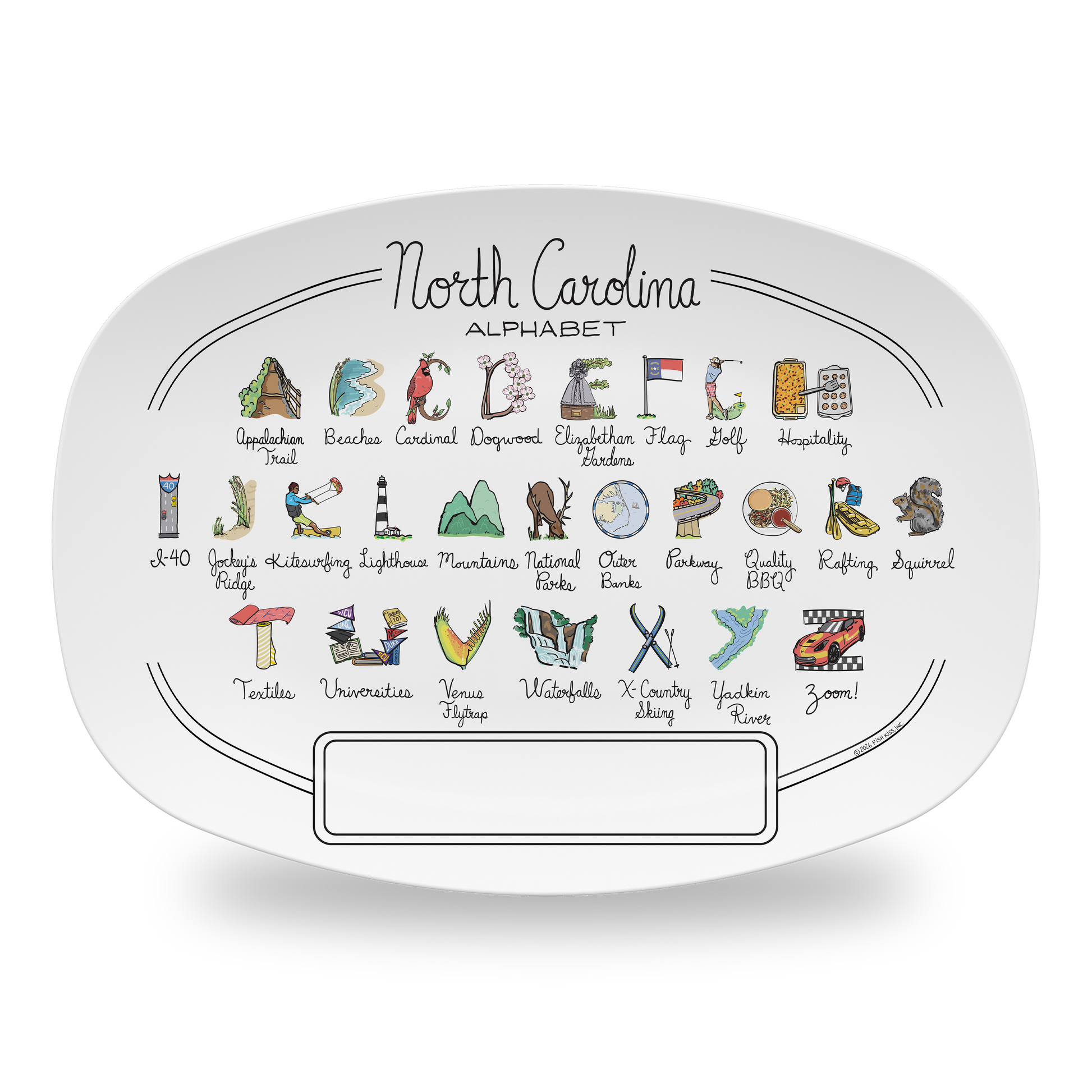 From the Appalachian Trail to the "Zoom!" of race cars, your North Carolina Alphabet Platter is filled with all things A-Z that make your state one-of-a-kind. Our unique platter is handmade from revolutionary new material, (similar to a heavy plastic), that is: