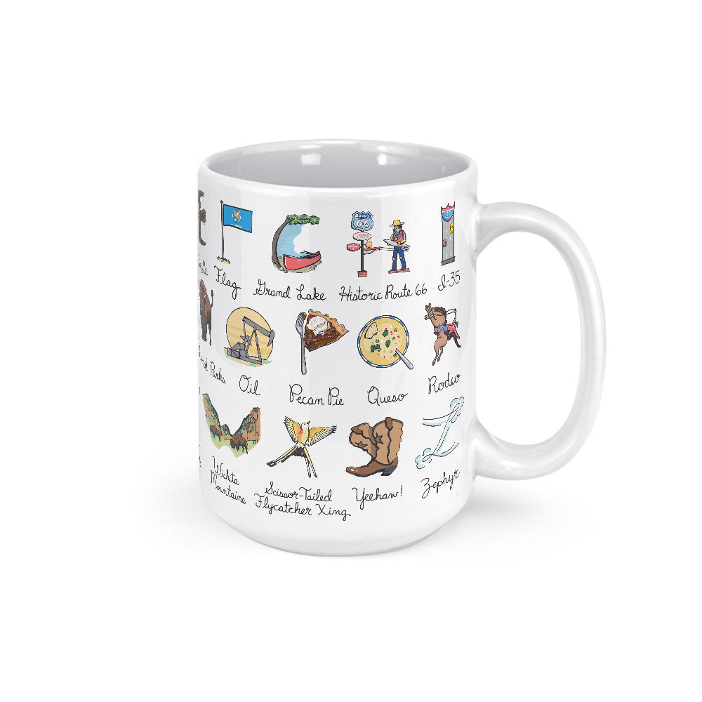 From the Arrowheads to Zephyrs, your Oklahoma Alphabet Mug is filled with all things A-Z that make your state one-of-a-kind. Bring the comfort of home with you as you sip from this large 15 oz. mug.