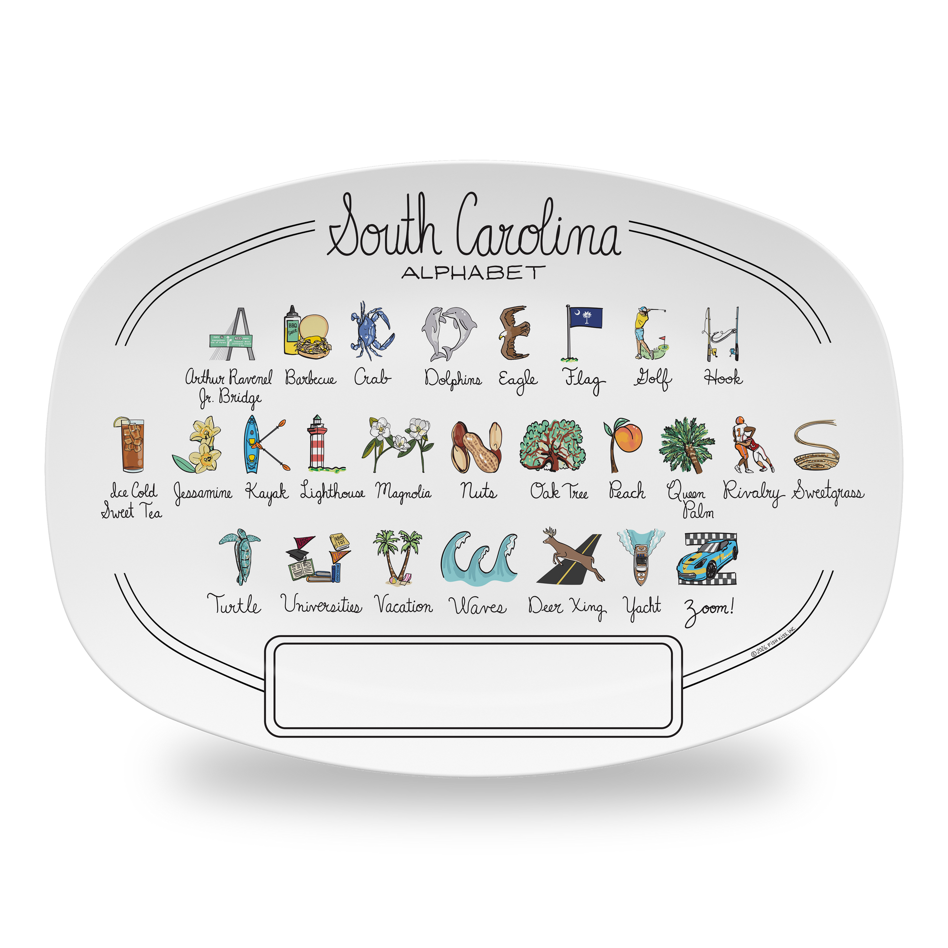 From the Arthur Ravenel Jr. Bridge to the "Zoom!" of race cars, your South Carolina Platter is filled with all things A-Z that make your state one-of-a-kind. Our unique platter is handmade from revolutionary new material, (similar to a heavy plastic), that is: