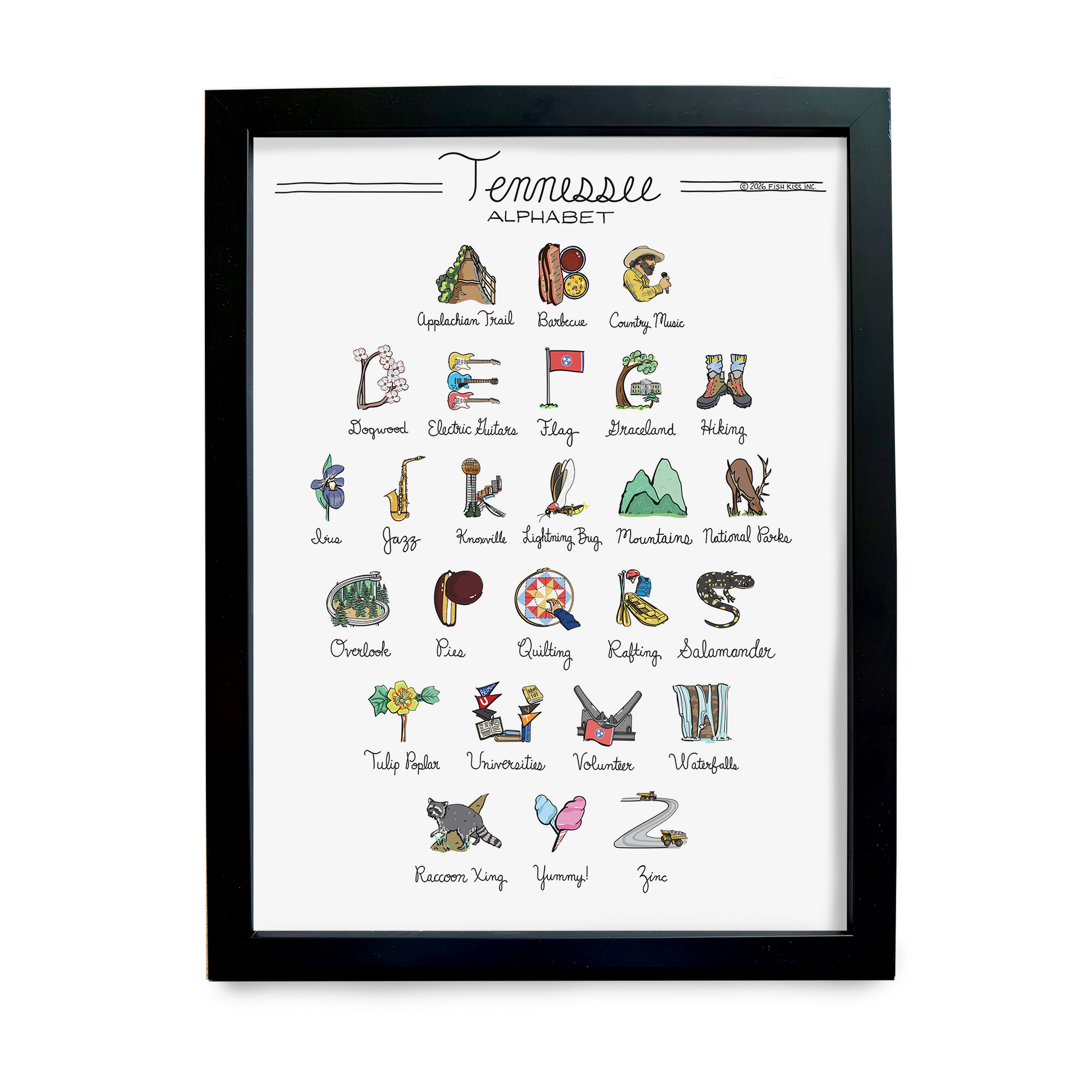 From the Appalachian Trail to mining for Zinc, your Tennessee Alphabet Framed 12"x16" Print is filled with all things A-Z that make your state one-of-a-kind. This Fish Kiss art is printed on high quality thick matte fine art paper and framed using a solid wood frame. Additional details include: