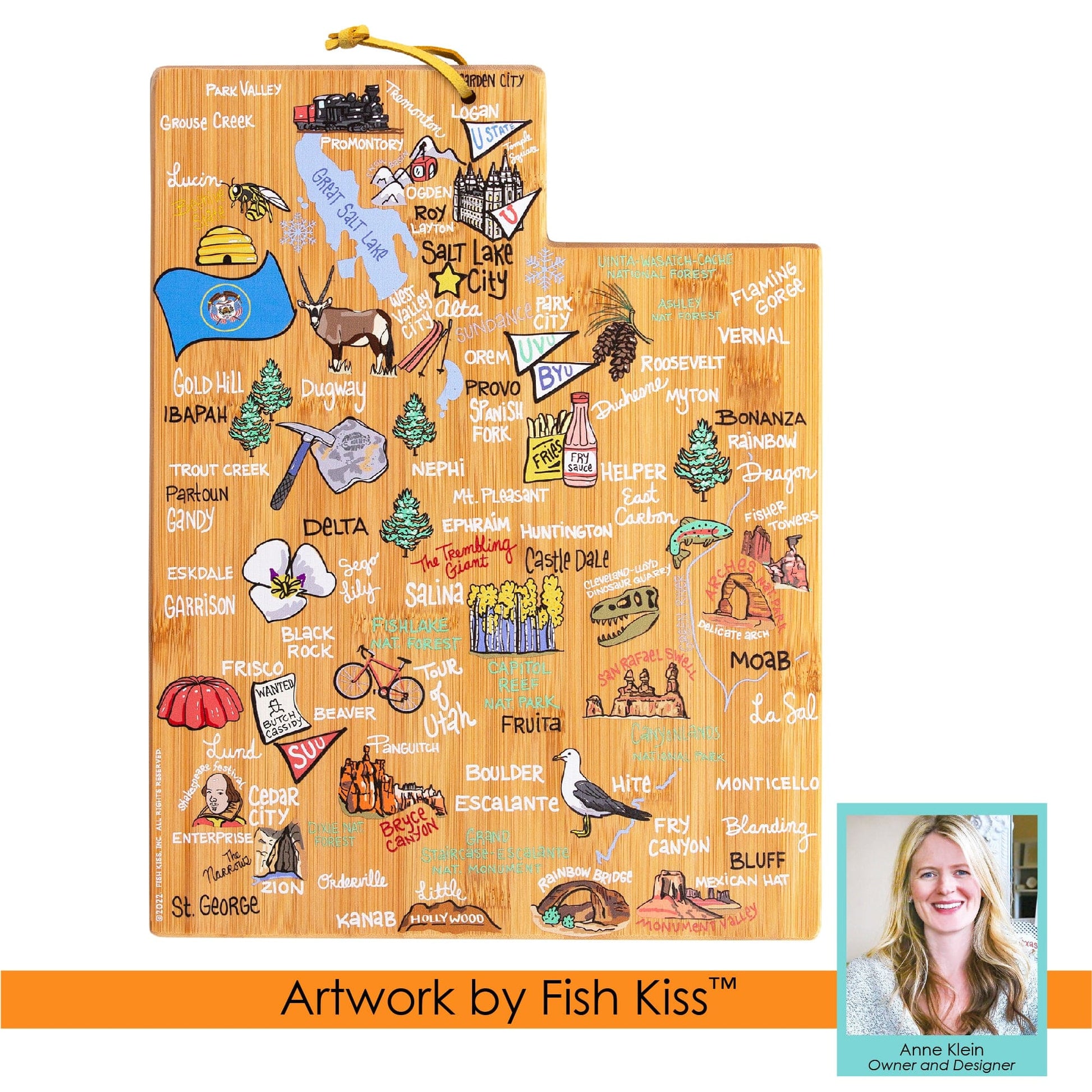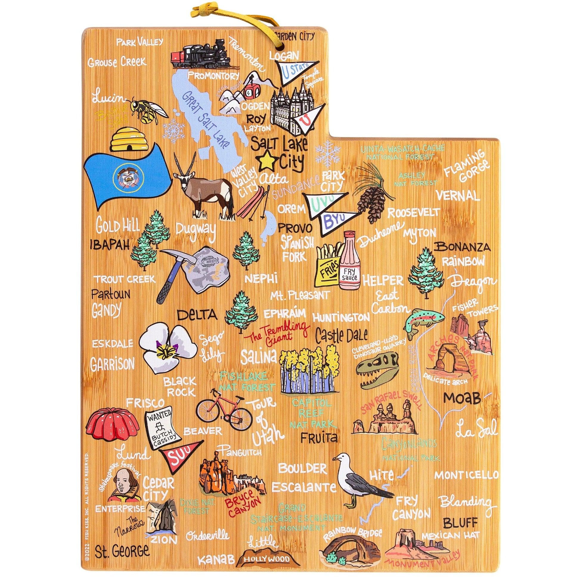 Celebrate life in The Beehive State with the Totally Bamboo Utah State Shaped Cutting Board with Artwork by Fish Kiss. This Utah shaped board features beautifully illustrated artwork by Fish Kiss artist Anne Klein of all the top towns and attractions in the state— see if you can find your home town! A fun and unique choice as a charcuterie board, you and your guests will love reminiscing about all of your favorite places featured on the board. Before serving, flip the board over for use as a knife-friendly bamboo chopping board on the blank back side. When not in use, the included hang tie allows the board to easily double as wall art. Show off your love of Utah in your kitchen, dining room, den or office. The Utah Cutting Board with Artwork by Fish Kiss is a great gift idea for anyone on your list that loves Utah. The artwork is applied using a specialized UV printing technique that's safe for food contact and will maintain its beautiful color. Caring for the board is easy; simply hand wash with warm water and soap. Do not soak or wash in the dishwasher. The Utah board measures 11" x 14-1/4" x 5/8".
