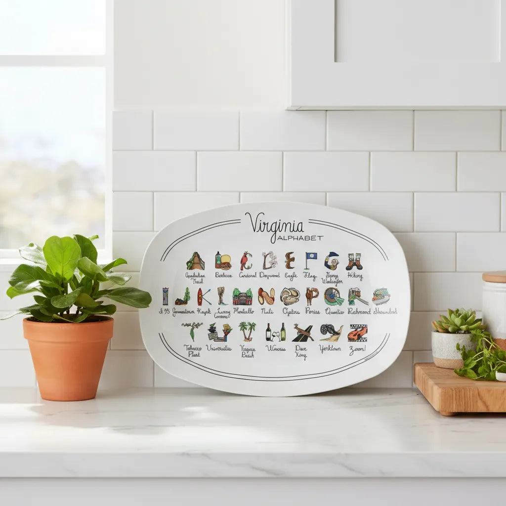 From the the Appalachian Trail to the "Zoom!" of race cars, your Virginia Platter is filled with all things A-Z that make your state one-of-a-kind. Our unique platter is handmade from revolutionary new material, (similar to a heavy plastic), that is: